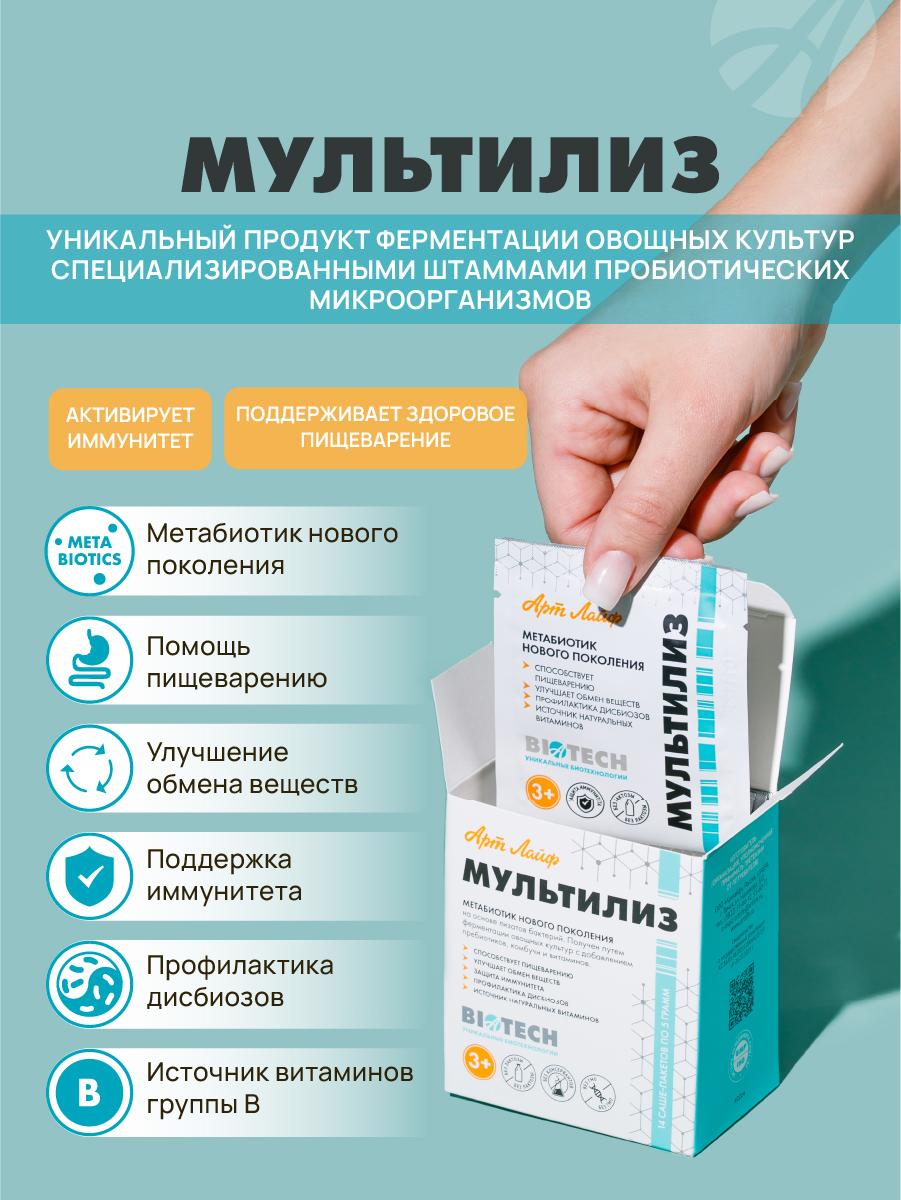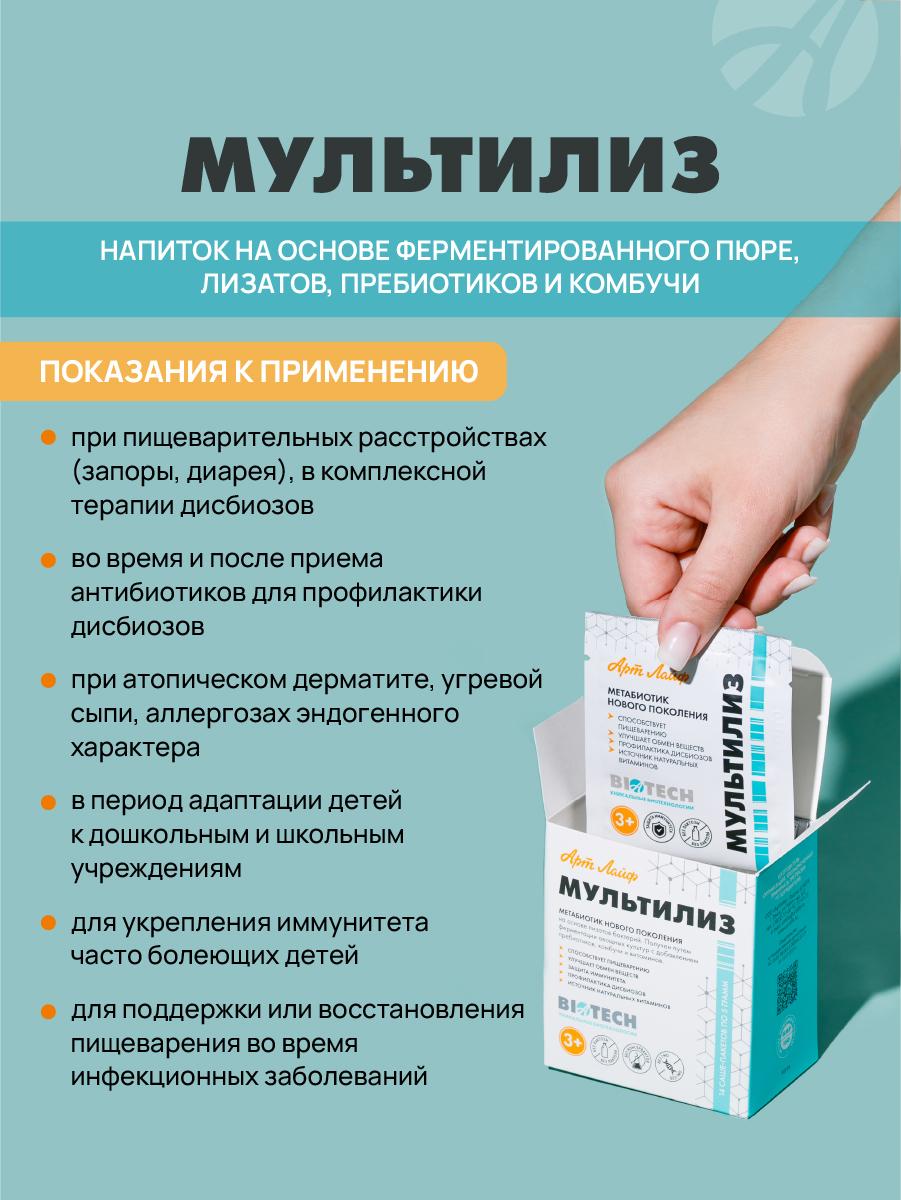Беспокоят проблемы с пищеварением или частые простуды? «МультиЛиз» — натуральный метабиотик для восстановления микрофлоры кишечника и укрепления иммунитета. Подходит взрослым и детям с 3 лет. Ключевые характеристики: • содержит бактериальные лизаты 4 штаммов полезных бактерий; • включает ферментированное тыквенное пюре и комбучу; • обогащён пребиотиками (лактулоза, гуаровая и ксантановая камедь); • не содержит молока и лактозы; • подходит для приёма во время и после антибиотиков; • не требует особых условий хранения; • разрешён детям с 3 лет. Почему выбирают «МультиЛиз»: • натуральный состав без искусственных добавок; • комплексное действие на микрофлору и иммунитет; • безопасность для людей с пищевой чувствительностью; • удобство приёма (1 саше пакет в день); • поддержка пищеварения и иммунитета в один курс. Наш товар vs обычные аналоги: 1. Сочетание лизатов и пребиотиков — работает сразу в двух направлениях. 2. Безмолочная формула — подходит людям с непереносимостью лактозы. 3. Подходит детям с 3 лет — широкий возрастной диапазон применения. FAQ: • Это лекарство? Нет, это БАД. Перед приёмом проконсультируйтесь с врачом. • Поможет после антибиотиков? Да, «МультиЛиз» восстанавливает микрофлору — уточните схему приёма у специалиста. • Есть противопоказания? Возможна индивидуальная непереносимость; ознакомьтесь с инструкцией перед приёмом. Не откладывайте заботу о здоровье — закажите «МультиЛиз» уже сегодня! Количество товара ограничено. Узнайте больше о продукте и его действии на сайте производителя.