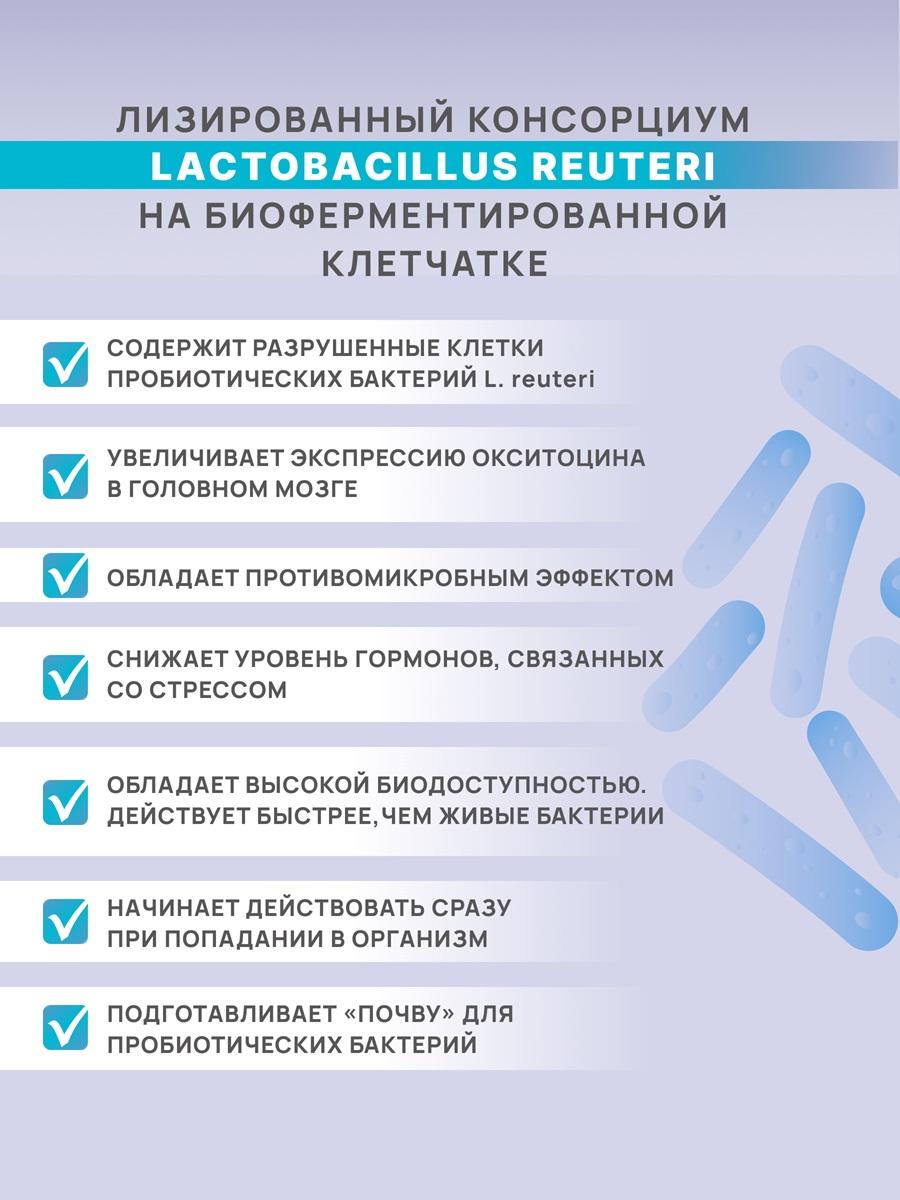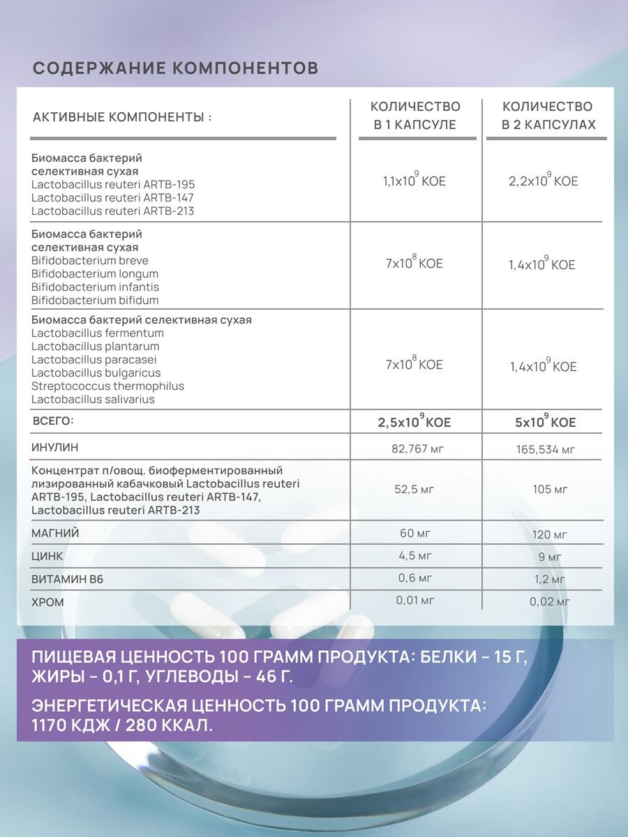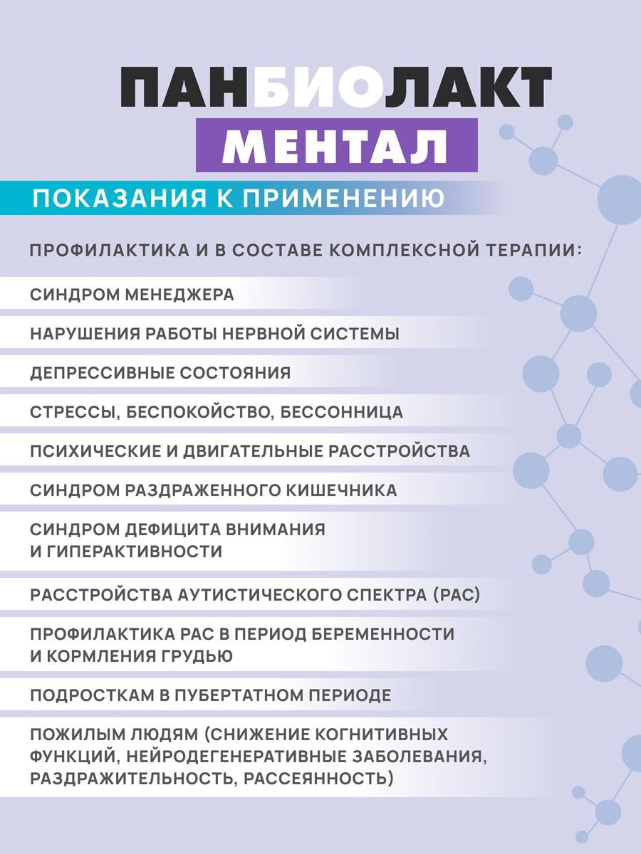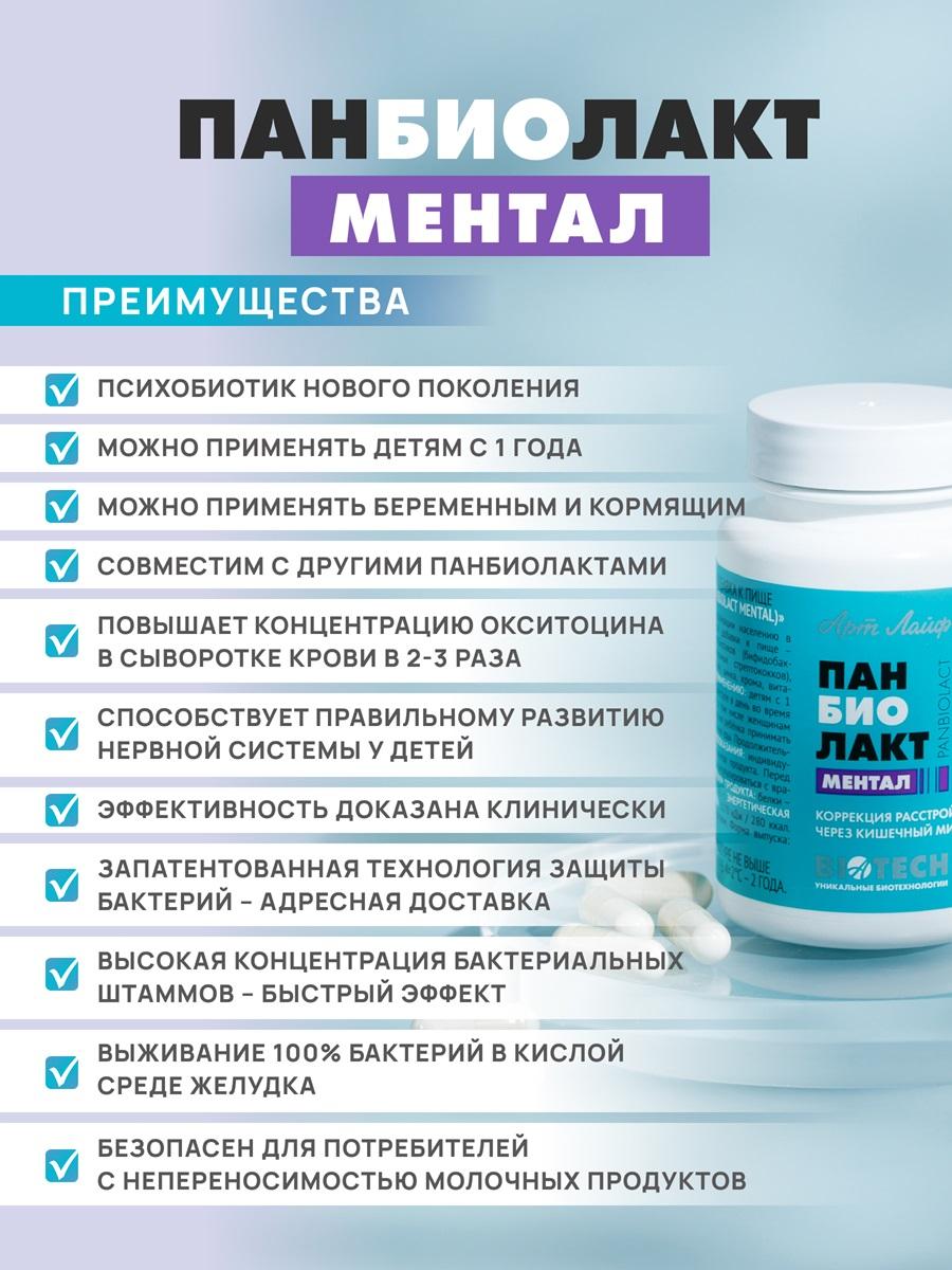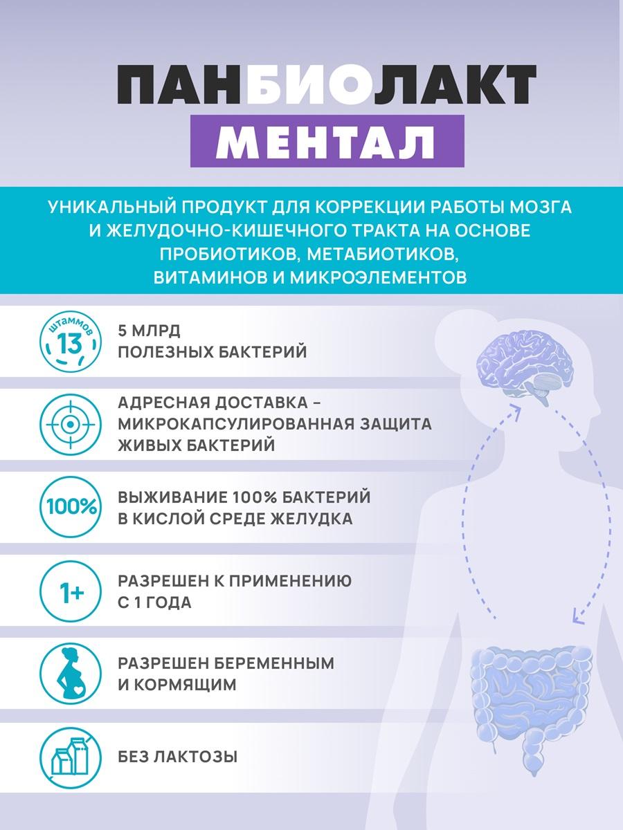 Чувствуете тревогу, раздражительность, трудности с концентрацией? Ваш кишечник может влиять на настроение и когнитивные функции. Панбиолакт Ментал — психобиотик, который через микробиом кишечника поддерживает работу мозга. Эффективность доказана клинически. Ключевые характеристики: • 13 штаммов живых бактерий; • ультрализат трёх штаммов Lactobacillus reuteri; • содержит витамин В6, цинк и магний; • микрокапсульная защита бактерий; • курс — 1 месяц (1 капсула в день); • 60 капсул в упаковке; • безопасен при непереносимости лактозы. Почему выбирают Панбиолакт Ментал? • Двойное действие: корректирует микробиом кишечника и влияет на психическое состояние. • Быстрый эффект: ультрализаты работают сразу, пока бактерии закрепляются в кишечнике. • Научная основа: состав разработан с учётом взаимосвязи «кишечник — мозг». • Безопасность: не содержит лактозу, подходит при пищевой чувствительности. • Удобство: одна капсула в день — минимум усилий для результата. Наш товар vs обычные пробиотики • Панбиолакт Ментал: 13 штаммов бактерий + ультрализаты + витамины; воздействует на психику через микробиом; микрокапсульная защита. • Обычные пробиотики: 1–2 штамма бактерий; только поддержка кишечника; нет дополнительной защиты бактерий. Часто задаваемые вопросы: • С какого возраста можно принимать? С 18 лет. • Как долго ждать эффекта? Первые улучшения возможны уже через 2–3 недели; полный курс — 1 месяц. • Есть ли противопоказания? Индивидуальная непереносимость компонентов. Перед приёмом проконсультируйтесь с врачом. Не откладывайте заботу о психическом здоровье! Закажите Панбиолакт Ментал прямо сейчас — подарите себе ясность мышления и эмоциональное равновесие. Узнайте больше о продукте и его преимуществах на сайте производителя!