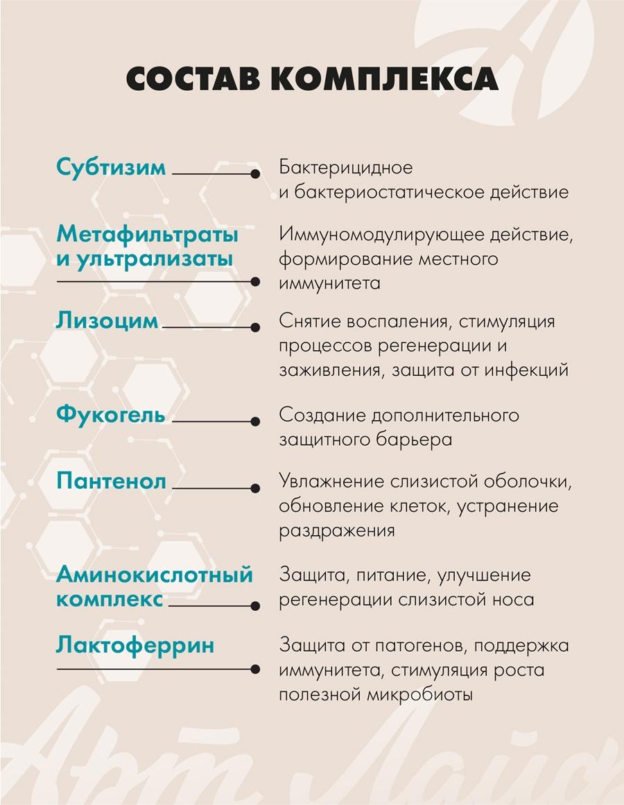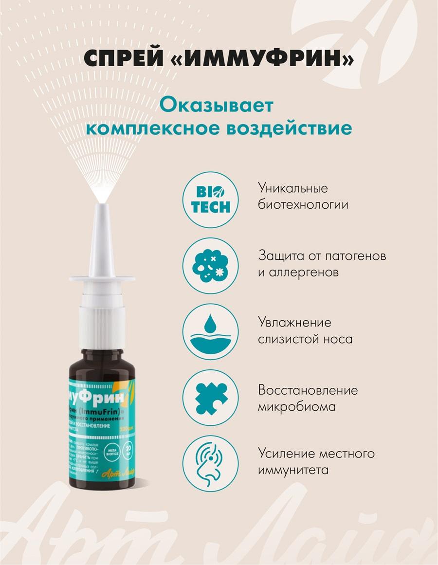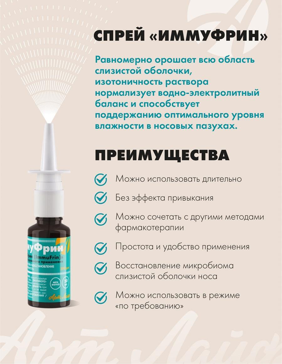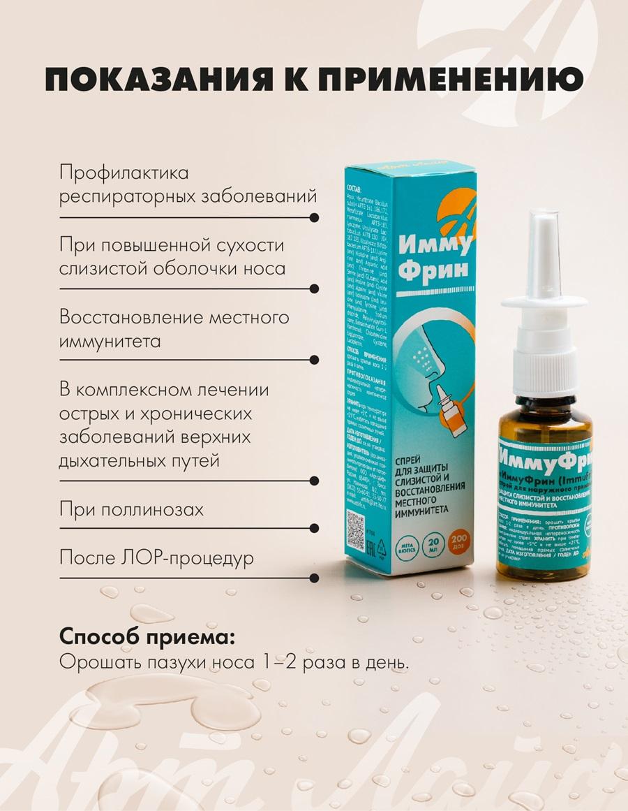 Для защиты и восстановления местного иммунитета. Спрей «ИммуФрин (ImmuFrin)» оказывает комплексное воздействие: повышает собственные защитные функции организма, укрепляет местный иммунитет, восстанавливает микробиом слизистой оболочки носа и состояние верхних дыхательных путей, защищает от внешних вредных факторов окружающей среды. Для поддержания здоровья слизистой носа необходимо: увлажнение слизистой оболочки носа и препятствование образованию корок; снабжение слизистой оболочки питательными веществами; борьба с местной патогенной микрофлорой; усиление местного иммунитета. «ИммуФрин» - это биотехнологический продукт. При его создании использованы современные технологические решения и последние научные достижения в области микробиологии, вирусологии и профилактической медицины. Он отвечает ключевым требованиям к средствам, обеспечивающим поддержание здоровья слизистой оболочки носа, а именно – увлажнение, питание слизистой, уничтожение патогенной микрофлоры (бактерий и вирусов), активация и поддержание местного иммунитета. Благодаря мелкодисперсному распылению спрей равномерно орошает всю область слизистой оболочки, а изотоничность раствора нормализует водно-электролитный баланс и способствует поддержанию оптимального уровня влажности в носовых пазухах. Активные компоненты в составе спрея обеспечивают надежную защиту и укрепление местного иммунитета. Преимущества комплекса защитный барьер от респираторных заболеваний; не сушит слизистую оболочку; эффективность благодаря комплексному воздействию; можно использовать в сочетании с другими методами фармакотерапии; возможность использования в режиме «по требованию» (поездки, перелеты, нахождение в закрытых помещениях и местах массового скопления людей, перед проведением домашней уборки, контактами с домашними животными и т.д.); быстрый эффект – действие активных компонентов напрямую на слизистую; не вызывает привыкания – можно применять длительно; простота и удобство применения. Торопись, в наличии осталось мало