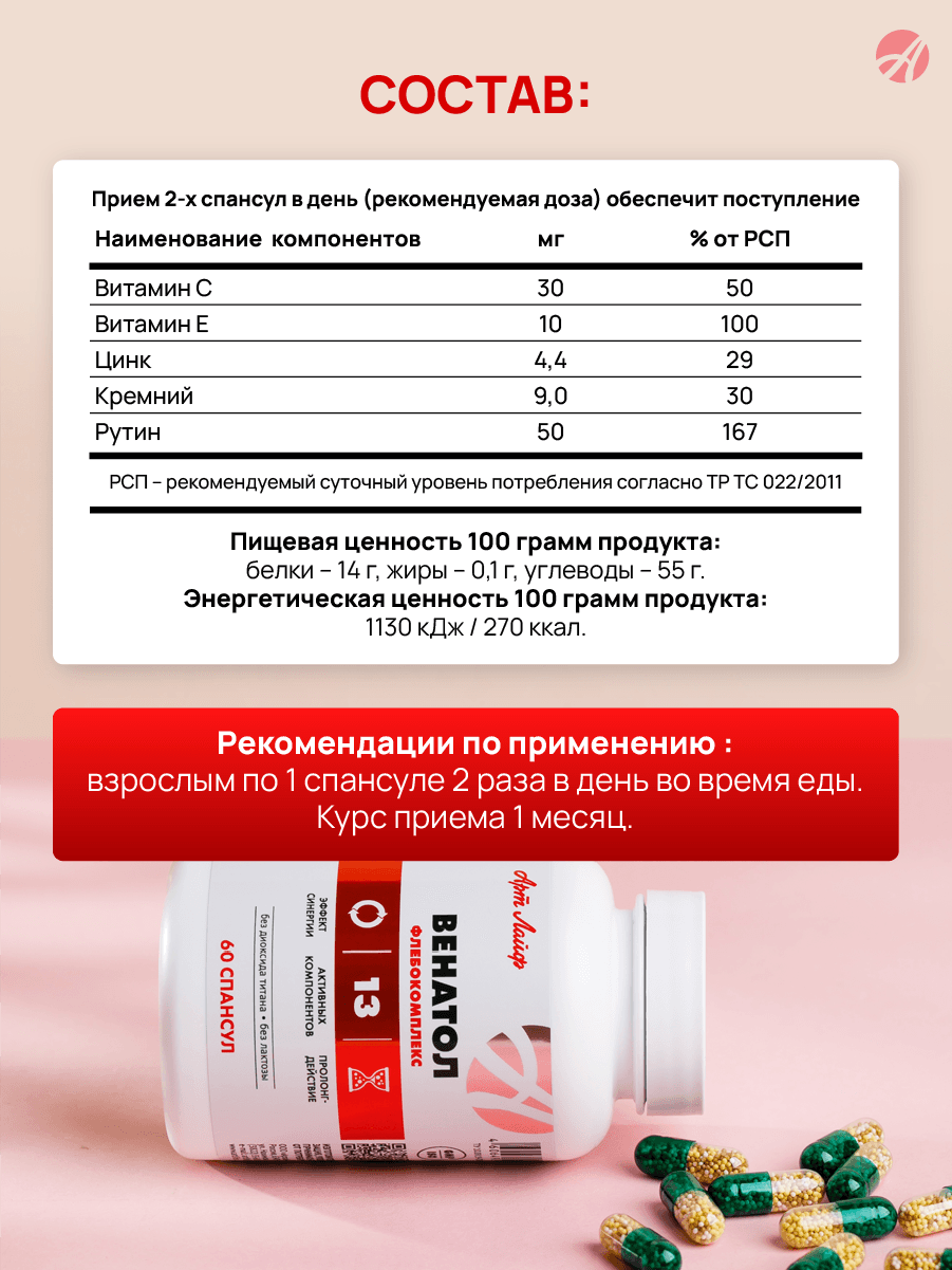 Тяжёлые, отёчные ноги к вечеру? Боитесь осложнений варикоза? Венатол укрепит сосуды, снимет усталость и вернёт лёгкость походки — без вреда для ЖКТ и с доказанным эффектом. Ключевые характеристики: содержит экстракт конского каштана и гинкго билоба; включает рутин, витамин С и глюкозамин; оказывает венотонизирующее и капилляропротекторное действие; улучшает микроциркуляцию и снижает отёчность; уменьшает риск тромбообразования; подходит для длительного приёма; 2 капсулы в день — простой режим. Почему выбирают нас: Синергия компонентов: растительные экстракты и витамины усиливают действие друг друга. Безопасность: натуральный состав, минимум противопоказаний, нет нагрузки на ЖКТ. Комплексный эффект: укрепляет вены, снимает отёки, улучшает кровообращение. Доказанная эффективность: результаты подтверждены клинически. Удобство: достаточно 2 капсул во время еды Наш товар vs обычные аналоги: Наш товар: многокомпонентный состав, клинически доказанный эффект, подходит для долгого приёма. Обычные аналоги: часто однокомпонентные, могут раздражать желудок, ограничены по длительности приёма. FAQ: Поможет ли при «синдроме усталых ног»? — Да, снимает тяжесть и отёчность уже в первую неделю. Перед приёмом проконсультируйтесь с врачом. Есть противопоказания? — Индивидуальная непереносимость, возраст до 18 лет. Когда будет эффект? — Первые улучшения заметны через 7–10 дней регулярного приёма. Не ждите осложнений — начните заботиться о венах уже сегодня! Закажите Венатол сейчас — количество по специальной цене ограничено. Подарите своим ногам лёгкость и комфорт! Узнайте больше о продукте и его преимуществах на сайте производителя!